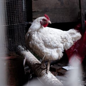 Phrased another way, in emotional language, a small white hen. A chicken, whose brain disturbed itself, alas, not with ways and means of mounting the barnyard pecking order, but rather grasping that lightning often accompanies rain, and that from eggs come biddies. A beady-eyed chicken whose neck jerks when she walks, whose head will tilt and her little comb flap just like all the rest of the chickens in the barnyard, though she tries and tries to break the habit.