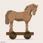 The question about the image at the top is that it depicts the Trojan horse, which aided invaders to attack Troy as reported in ancient literature. The dangerousness of its presence was unknown until too late. The invaders hidden in the horse were already in the town and it was too late to avoid a catastrophic takeover.