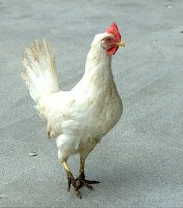 Phrased another way, in emotional language, a small white hen. A chicken, whose brain disturbed itself, alas, not with ways and means of mounting the barnyard pecking order, but rather grasping that lightning often accompanies rain, and that from eggs come biddies. A beady-eyed chicken whose neck jerks when she walks, whose head will tilt and her little comb flap just like all the rest of the chickens in the barnyard, though she tries and tries to break the habit.